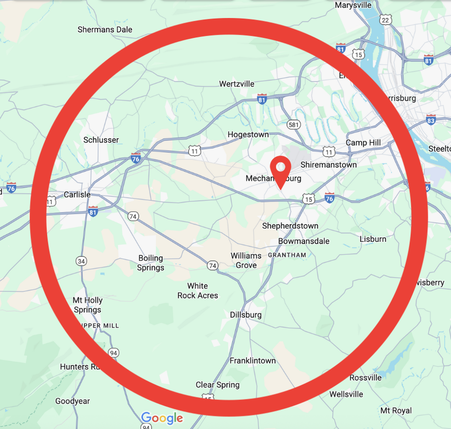The circle shown is a rough estimate of our service area. If you’re unsure whether you fall within the radius—or even if you’re just outside of it—please reach out! We’re happy to check and often able to make accommodations.